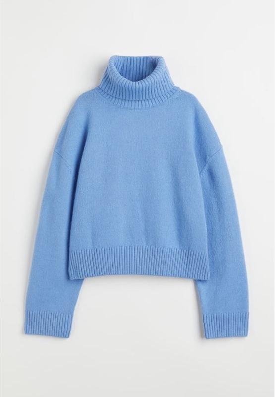Мʼякий теплий светр з коміром в дуже гарному відтінку синього. Стан ідеальний. Розмір вказано М овер. В складі є вовна. Довжина 54 Плечі 71 Рукав 52 По грудей 68