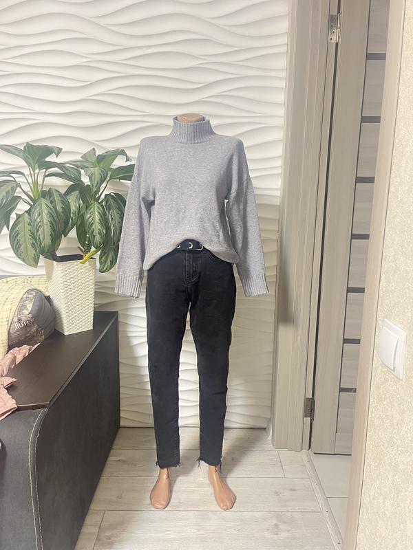 Сіра кофта з високим горлом і довгими рукавами, пряма та зручна.