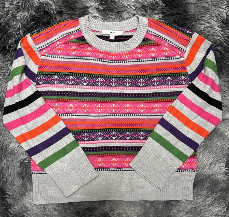 Яскравий светр Next Розмір: M (на Л теж буде, вільного крою) Матеріал: м’яка в’язка, приємна до тіла Колір: сірий з яскравими смужками та етно-візерунком у рожевих, фіолетових, зелених, помаранчевих і чорних тонах. Стан: відмінний, без плям і затяжок 100 акрил Стильний і теплий светр, який додасть кольору у ваш образ! Ідеально підходить для прохолодної погоди, чудово поєднується з джинсами або спідницею. Всі бірки на фото, фото на собі не роблю