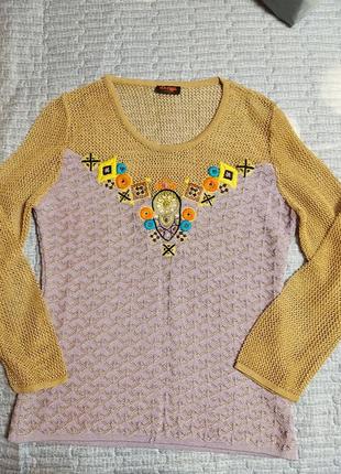 Красивейший лонгслив с ажуром и вышивкой.плотный низ как двойной.бирка срезалась о составе не скажу.Дорогая вещь.лимитка.размер С.длина 61 рукав 55 плечи 39.Состояние идеальное