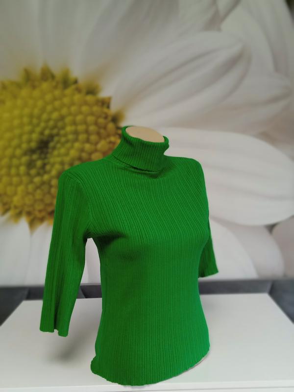 Класична однотонна кофтинка з насыщено зеленого цвета. Теплая и удобная. Приятная на ощупь. Фактурная машинная вязка в вертикальную полоску. Нить средней толщины. Тянется с легкостью. Ложится по фигуре. Закрита шия (гольф). Укороченный рукавчик за локоть. Есть размеры. 38р на пог-48-50 36р на пог-46-48 34р на пог-44-46