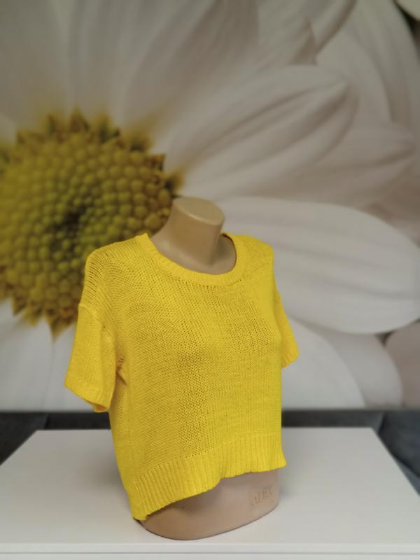 Стильна однотонна кофтинка з коротким рукавом насичено жовтого кольору. Легка та зручна. Приємна до тіла. Фактурна машинна в'язка. Нитка середньої товщини. Стрейч. Лягає вільно. Плечі спущені. Укорочена. Акуратний виріз. По спинці трохи довша. Є розміри. 34р на пог-44-46 36р на пог-46-48