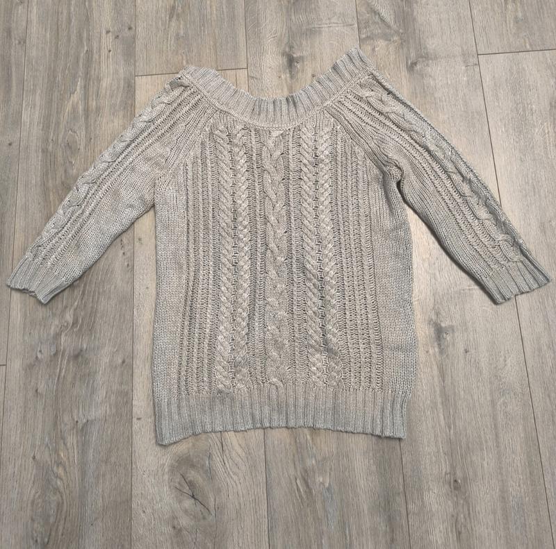 Очень нежный и приятный на ощупь свитерик серого с серебром цвета. Свитер имеет 3/4 рукава и на спинке завязывается на ленту.