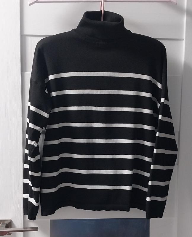 Гольф Primark р.S (44/46) Питательный, в хорошем состоянии, гольф Primark черный в белую полоску, с "горлом". Состав: 75% полиэстер, 25% вискоза. Замеры: грудная 50см, длина рукава от шеи 65см, длина 53см.
