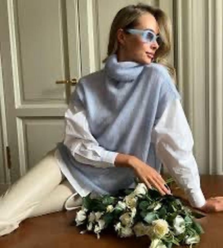 Трикотажний жилет або светр вільного крою без рукавів (оверсайз). Колір: Світло-блакитний. Деталі: Відмінною рисою є широкий асиметричний комір-застібка, який вільно лежить на шиї та плечах. Матеріал: з додаванням інших волокон, таких як , віскоза або поліамід, що робить виріб м'яким і ПОГ 64. Довжина 74. приємним на дотик. Жилет – британський бренд, відомий своїм стильним та сучасним підходом до жіночої моди.