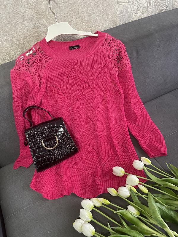 Ефектний в'язаний джемпер кольору фуксії з ажурними вставками Цей светр — ідеальне поєднання яскравого кольору, незвичайної фактури та витончених деталей, що додасть грайливості та стилю вашому образу. • Колір: Соковита та насичена фуксія (малиновий, яскраво-рожевий) – трендовий колір, який привертає увагу та чудово освіжає обличчя. • В'язка: Унікальний хвилястий візерунок по основній частині, що створює об'ємну фактуру. • Деталі: Ніжні ажурні вставки на плечах (кокетці), що додають витонченості та легкості. • Крій: Прямий, злегка приталений, з довгими рукавами. • Низ: Хвилястий (фестончастий) край по низу виробу, що підкреслює жіночність моделі. • Бренд: (Якщо видно на фото) Kangaroos (або інший, уточніть). Ідеальний вибір для тих, хто любить бути в центрі уваги!
