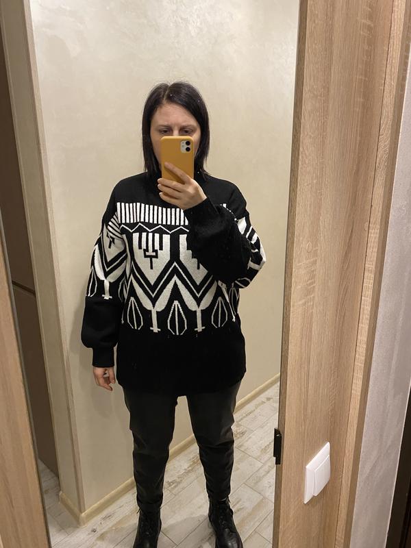 Чорно-білий светр вільного крою. В ідеальному стані . Дуже теплий , подвійна вʼязка. Комір стійка. Розмір XL. Sinsay.Заміри на останньому фото.
