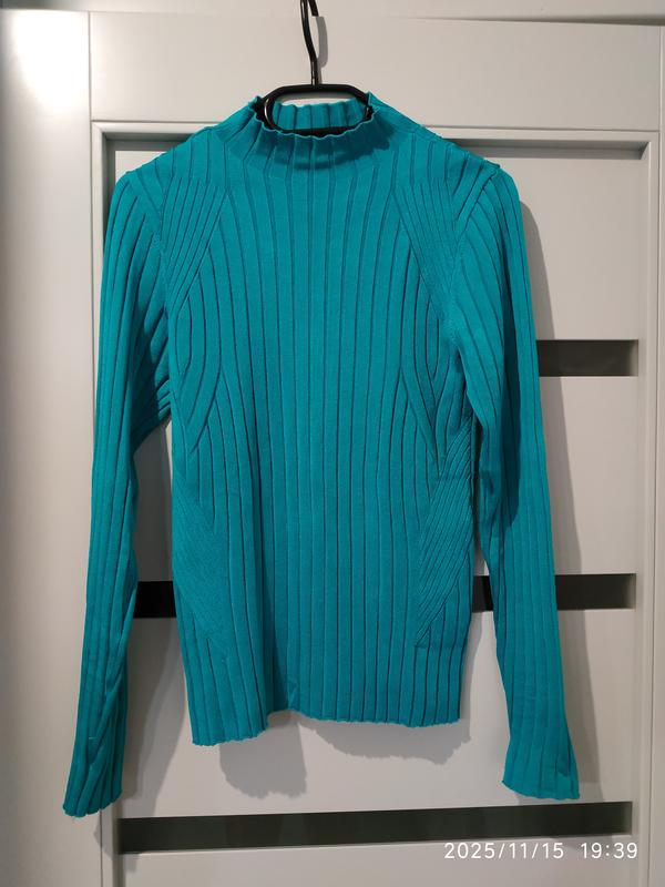 Гольф свитер красивого бирюзового цвета из вискозы 85% и полиамида. Приятный к телу. За счет рельефных резинок красиво садится по фигуре. Длина - 59, рукав 60, хорошо тянется.