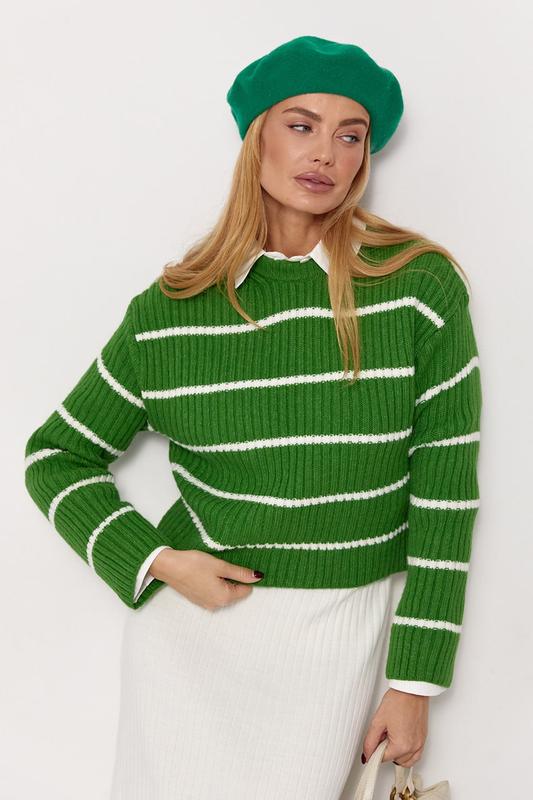 Країна: Туреччина Тканина: В'язка Склад тканини: 82% штучна шерсть, 9% поліамід, 9% PBT Розмір: S-L У светрі кругла горловина доповнена коміром з подвійної машинної в'язки, пройми опущені, прямий низ та довгі рукави йдуть без манжетів. Виріб повністю декорований горизонтальними смужками контрастного кольору. 74001.2