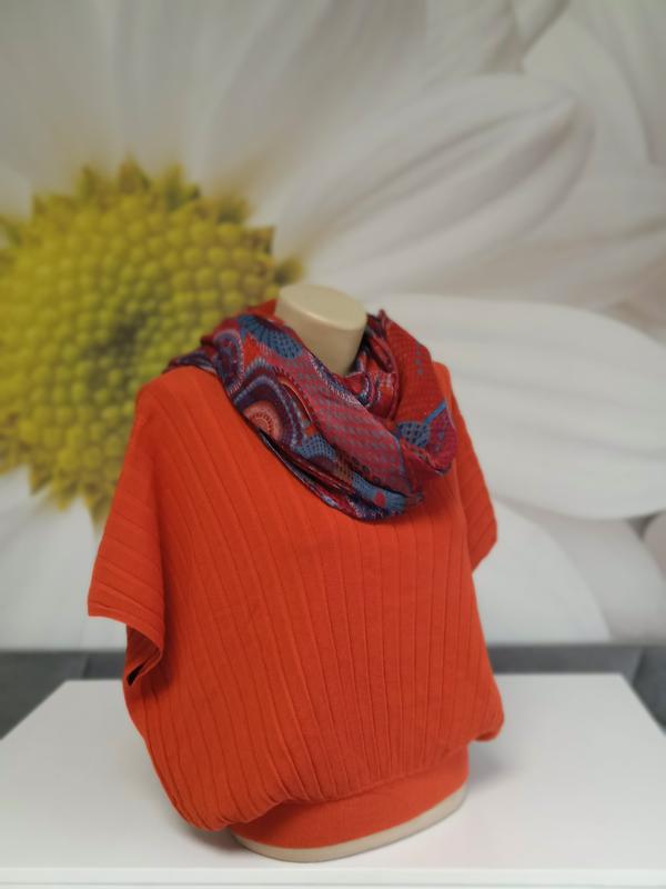 Стильная однотонная кофточка с коротким рукавом насыщено оранжевого цвета. Теплая и удобная. Приятная на ощупь. Гладкая машинная вязка с эффектом гофре. Нить средней толщины. Стрейч. Ложится свободно. Фасон-летюча миш. По низу на манжеті. Аккуратный вырез Красиво смотрится с шарфом в тон в комплекте (шарф может быть заменен, но в цвете). Есть размеры. 38р на пог-48-50 36р на пог-46-48