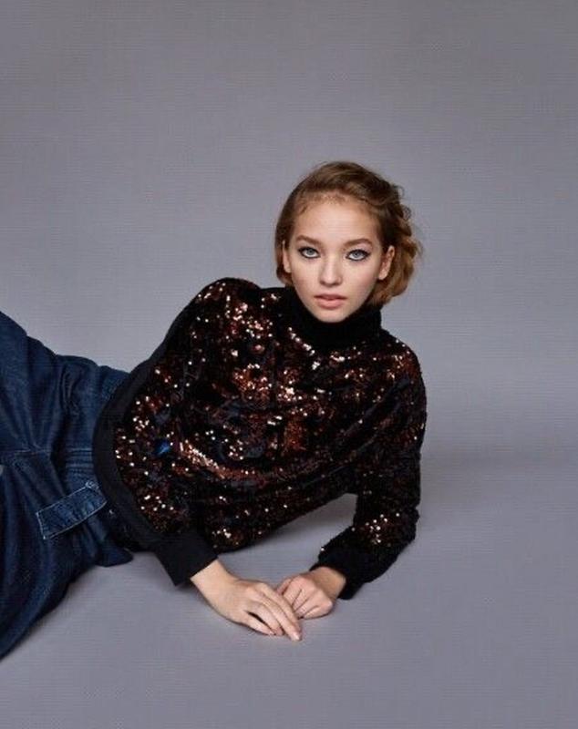 Zara Светр з горловиною розшитий по переду паєтками Тканина бавовна спинка , як у світшотів двонитка ,перед поліестер Розмір S, буде і на М Стан ідеальний Груди 56 Рукав від горловини 70 Довжина 72