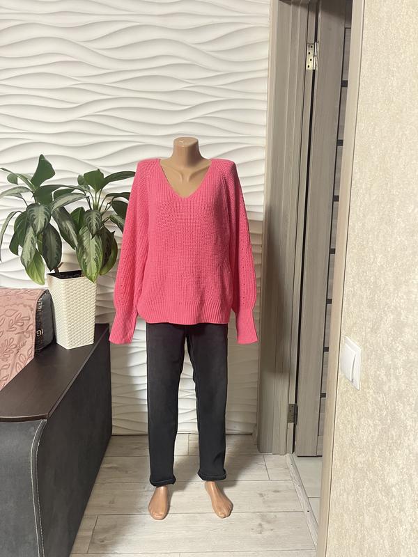 Яскравий рожевий в’язаний светр з V-подібним вирізом і об’ємними рукавами, вільного комфортного крою. Стан нового