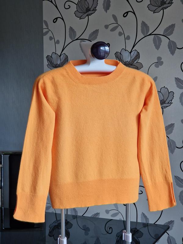 Свитер из шерсти яркого апельсинового оттенка. Ног-47см, рукав от горловины--62см, длина-53см, плечи-44см. Есть нюанс-трешки более плотный (эксплуатировался), в цене учитывала.