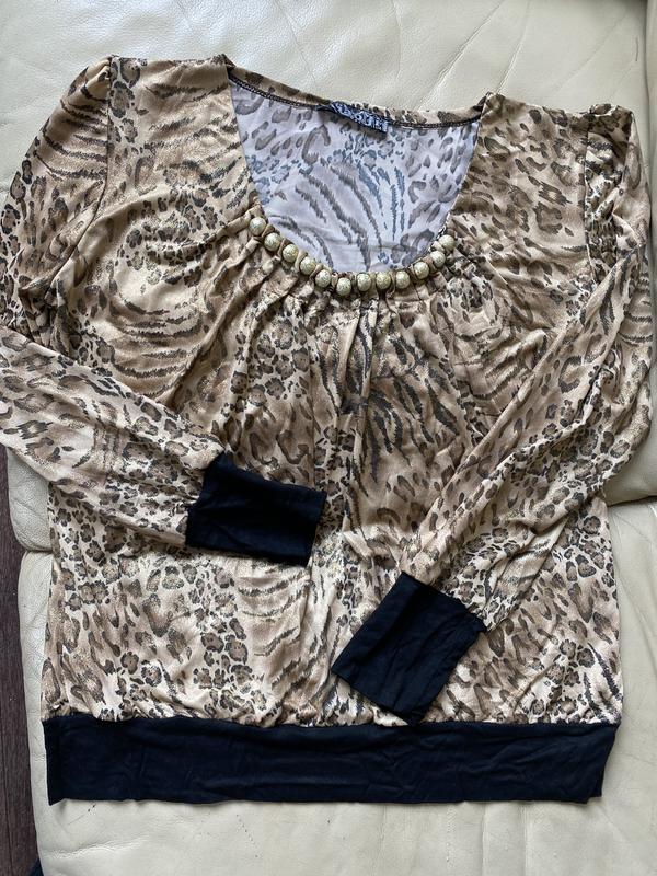Легкий светрик,леопардовий принт,рукав та талія на манжетах ,спереду прикраси,святковий.Гарно тягнеться .Виробник Турція Рукав-60 см,по спинці-63 см Ціна всього 250 грн