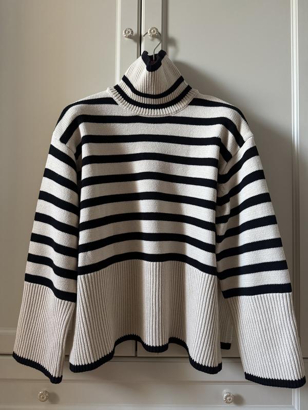 Новый свитер Toteme Размер М , посадка свободная , подойдет вообще на любой ОГ - Плечo спущено 56 см Пог 69 см Рукав 57 см Длина 66 см 56 % шерсть ,44 % хлопок , ткань теплая и мягкая, не колется Цена бутика 590 евро , цена продажи 240 евро по курсу на день оплаты