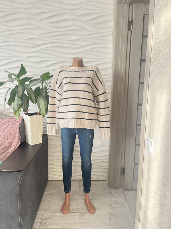 Бежевий в’язаний светр у чорну горизонтальну смужку, з вільним кроєм та довгими рукавами,теплий
