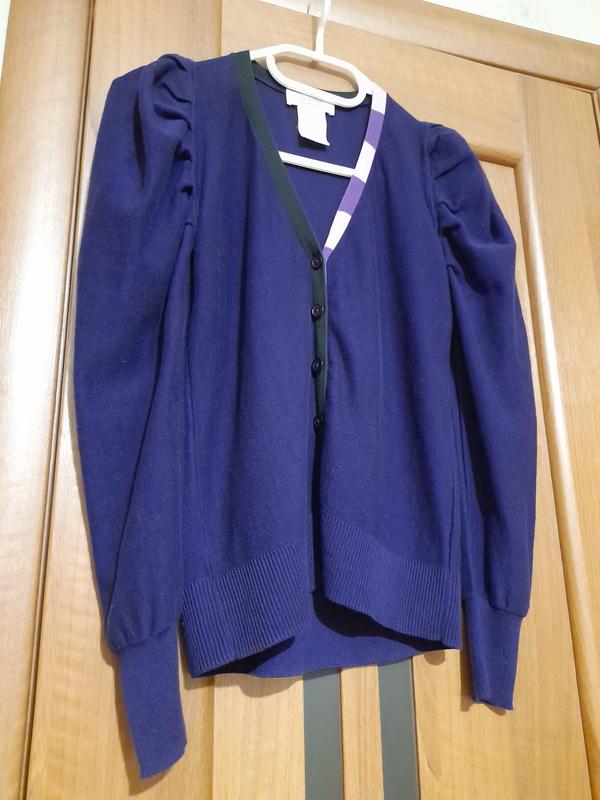 Состояние новой. Без броков. Идет в размер. Но на s садится более облегающее, на xs более спокойно и свободнее, кто как любит. Цвет не электрик, а темно-синий, на фото яркий вышел. Дизайн очень интересный: акцент на плечах за счет защипов, полосатый принт вдоль пуговиц. Длина до тазовой кости. Приятная на ощупь, мягкая. Нюанс в том, что была пошита наизнанку, то есть лицевая сторона оказалась внутри кофты, на фото указала. На функциональность не влияет, на внешний вид-не критически, сама не сразу заметили. Можно было бы сказать, что так надо), но это не присуще данному бренду. В цене учтены.