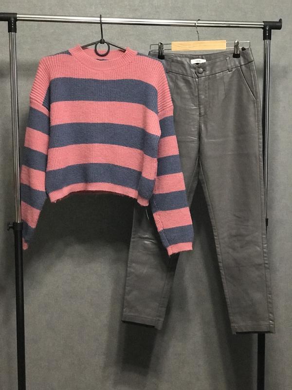 Модний та універсальний комплект для повсякденних образів. Виглядає дуже актуально й стильно, речі легко комбінуються як разом, так і окремо. Светр: Вʼязаний, м’який та приємний до тіла Короткий крій (кроп) Смужка: рожевий + синьо-сірий Вільна посадка Стан відмінний Штани: Екошкіра Колір: сірий Прямий крій Акуратна посадка Стан дуже хороший, без дефектів Розмір: S–M Підійде для: повсякденних, міських та casual-образів Можна носити разом або окремо 📦 Швидка відправка