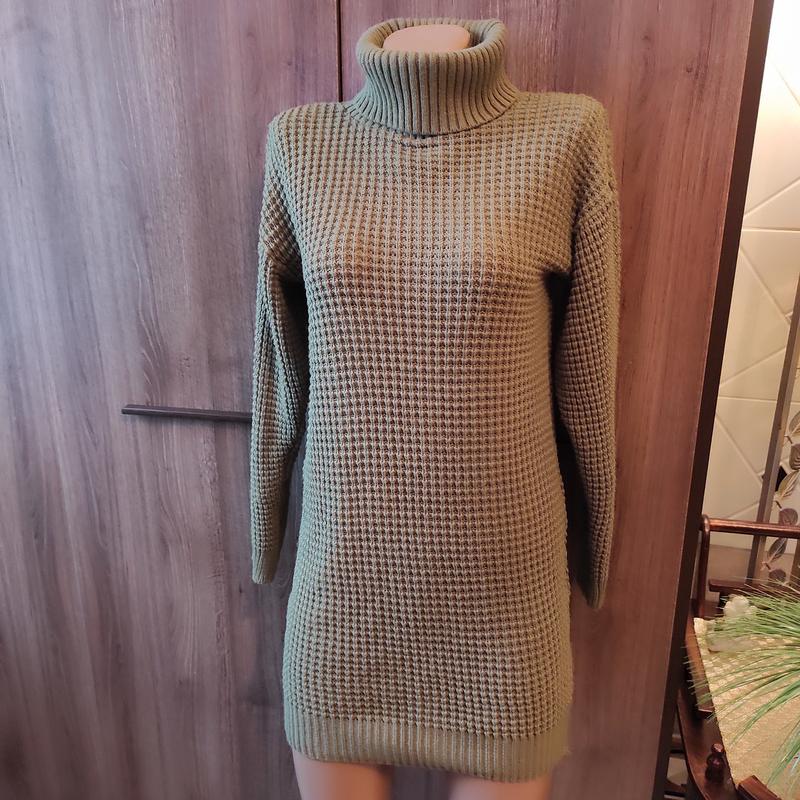 Новый свитер без бумажной этикетки, объемная в **повязка, длинный и с высоким воротом отлично пледет для прохладного сезона, приятный оливковый цвет, тянется легко, свитер удобный теплый и качественный; ПОГ-44-48 длина-77 рукав от воротника- 63