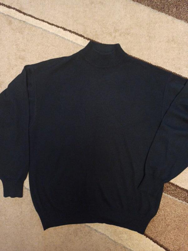 свитер темно-синего цвета, бирка с составом отсутствует, но это шерсть мериноса с акрилом. Рукав спущенный, воротник стойка. Ширина под рукавами 54 см, длина 63 см, рукав от горловины 73 см. Продажа по полной оплате на карту.