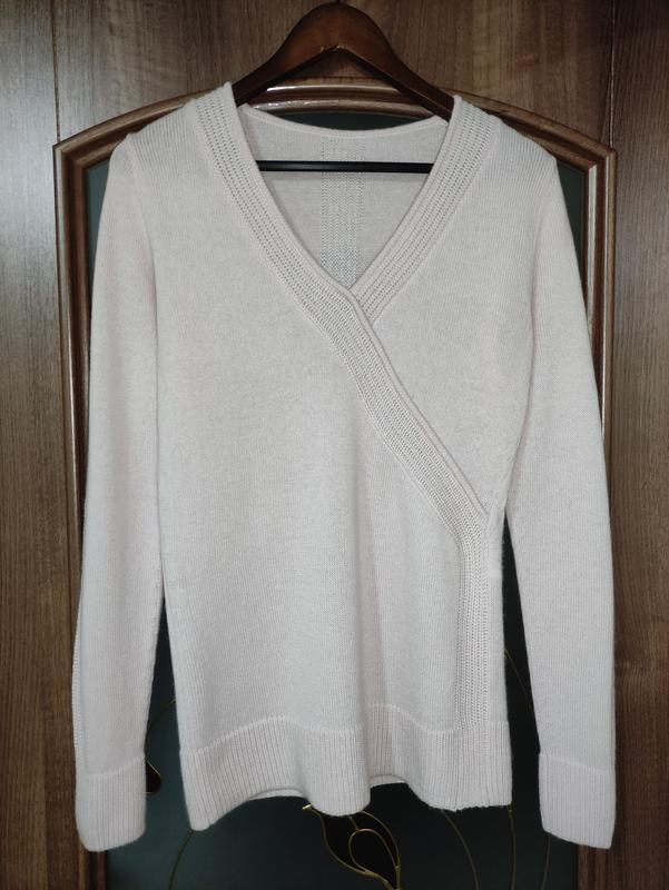 Элегантный шерстяной / кашемировый свитер. В идеальном состоянии. Цвет - розовый. Подойдет на М, L, ориентируйтесь, пожалуйста, на замеры: длина от середины плеча до низа - 70 см., плечи - 38 см., рукав - 68 см., ПО под рукавами - 48 см., ПО по низу - 44 см. Свитер толстый, очень мягкий и нежный, как 100% кашемир. Спереди имитация запаха, на рукавах и сзади по центру вывязаны полоски. Состав: 90% шерсть, 10% кашемир.