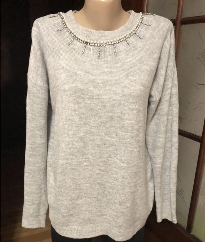Мягкий свитер. Плечи приспущены. Вверху колье из камней. Прямого кроя. Длина- 60 см. Ширина (в груди)- 52 см. Рукав (от шеи к низу)- 74 см. Отправляю Новой и Укр. Почтой