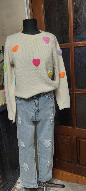 Красивый свитер в цветные сердечки очень стильный и красивый.Состав 68%-полиэстр,20%- полимид,10% шерсть,2%-пандекс.Свитер приятный на ощупь не кусается.Довж.по спинке от воротника 52см.ОГ 100см.Довж.рукавна от плеча 58.пояс на полуоб.45см. тянется. Перчатки,пояс и горловина идут манжетом приподнята.
