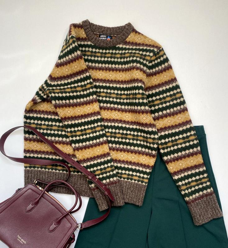 Теплый шерстяной свитер унисекс Army and Navy с жаккардовым узором. Свитер плотный (не сбитый), мягкий, не "кусается". Плечи 41-42 см (могут быть спущенными), длина рукава 64 см, половина бицепса 18 см, ширина 53 см, резинка внизу 46 см, длина от плеча 64 см