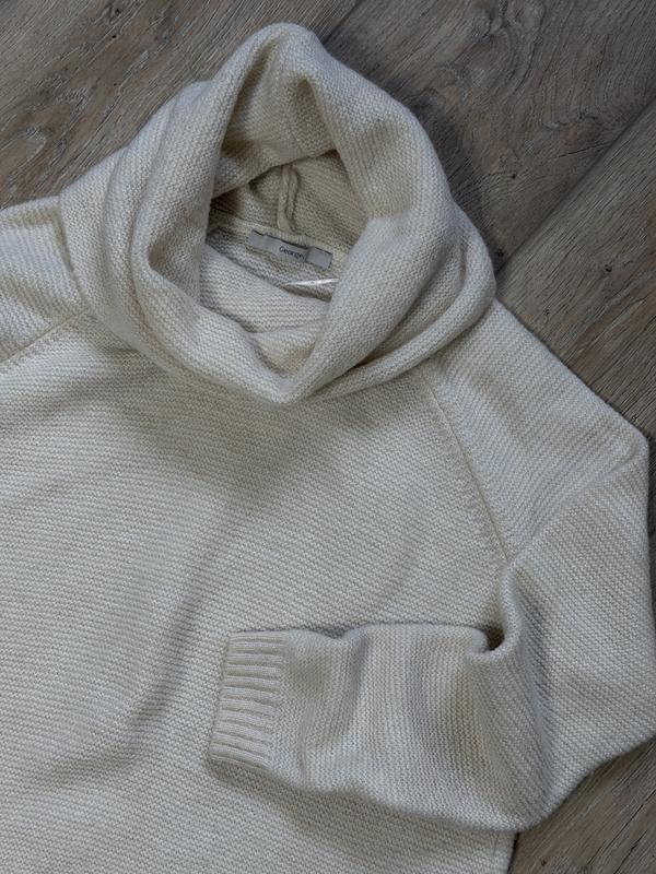 Розміри в плечах 40 см приблизно рубець опущений, довжина рукава від горловини 65 см , довжина 62 см Молочний в’язаний светр з м’якою текстурою та об’ємним хомутом. Модель прямого силуету, з довгими рукавами та еластичними манжетами. Дуже теплий і комфортний, підходить для повсякденних образів та затишних холодних днів.