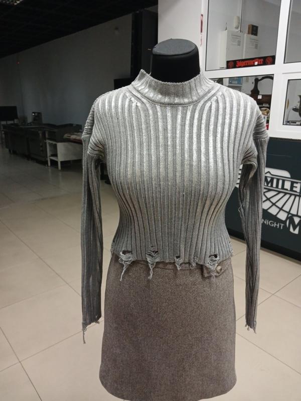 серо серебристый женский свитер в рубчик с рваными деталями, часто называемый "рванка". Это популярный элемент стиля, Характеристики Стиль Свитер имеет укороченный крой (кроп-топ) и эффект рваных краев внизу и на манжетах, что добавляет образу раскованности и стиля. Материал/Вязкая: Изделие выполнено из трикотажа в мелкий или средний рубчик, часто с добавлением акрила или шерсти, что делает его эластичным и комфортным. Детали: Модель с высокой горловиной (гольф) и длинными рукавами Турция длина 44 см плечи приспущены 55 см рукав 53 см грудь 98 см 60/454