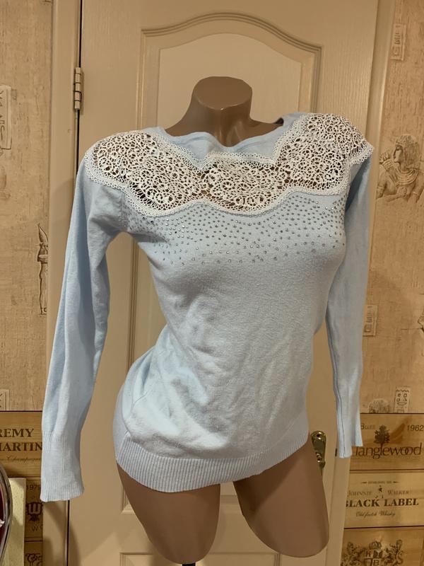 Кофточка нарядная небесно-голубого цвета с стразами и гипюром , пог 42 рукав реглан от ворота 62 длина 58, состав ткани смешанный