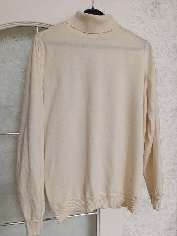 джемпер с высоким воротником, цвета сливочного масла. Длина 68см, ПОГ 58см, по низу по резинке 47см, рукав 65см, плечо 11см, высота воротника 14см.