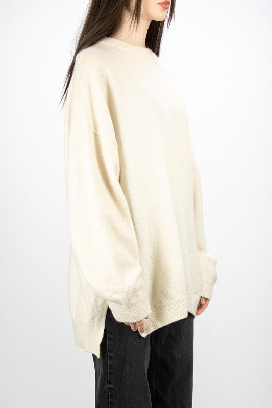 Свитер молочного цвета. Оверсайз. Размер по бирке S. Замеры: плечи 61 см (особенность дизайна изделия, при которой плечевые швы расположены ниже естественной линии плеча), длина рукава от плечевого шва 48 см, полуобхват груди 64 см, длина по спине по центру 76 см, длина спереди по центру 64 см. Состав: 73% шерсть, 23% полиамид.