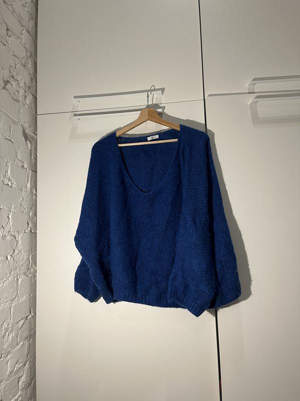 Затишний об’ємний светр насиченого синього кольору. Легка пухнаста фактура, приємний і теплий. Стан чудовий. Розмір: універсальний S–M (oversize). Підходить для щоденного носіння та затишних образів.