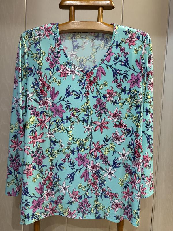 В наявності гарна кофтинка у кольорах. Розмір вказаний 18/20. Склад: 95% поліестер і 5% спандекс, тканина м'яка та добре тягнеться. ПОГ-61 і ще добре тягнеться, довжина-72, плечі — 46, довжина рукава — 59, ширина низу — 65 і ще добре тягнеться.