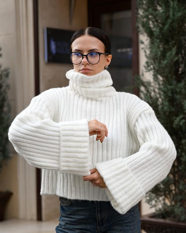 Склад: 10% вовна, 10% віскоза, 80% поліестер М’яка сумішевий пряжа дарує відчуття тепла і ніжності, не викликає подразнень і не колеться. Тканина дихаюча, тримає форму і стійка до катишків. Опис: Светр Aurora — це втілення затишку і легкості. Об'ємна в'язка, укорочений крій і акцентні широкі рукава створюють сучасний силует у стилі soft minimalism. Високий комір захищає від холоду і надає образу елегантності. Ідеально поєднується з джинсами, спідницями і пальто oversize. Деталі: Об'ємний комір-гольф Широкі рукава з щільним манжетом М’яка еластична резинка по низу Укорочена довжина