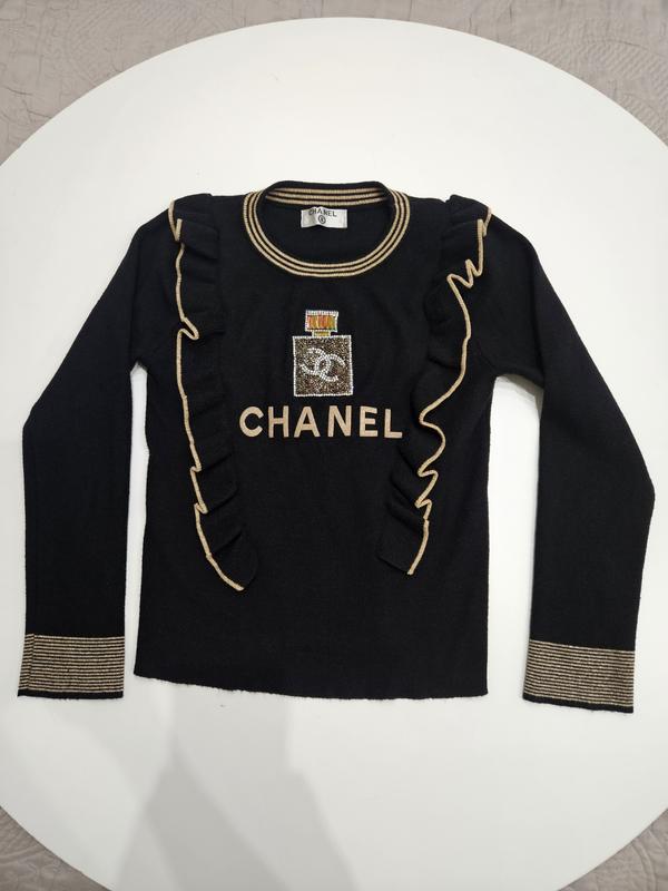 Черный свитер Chanel с оборками и вышивкой в виде флакона парфюма. Тканина тягнеться.