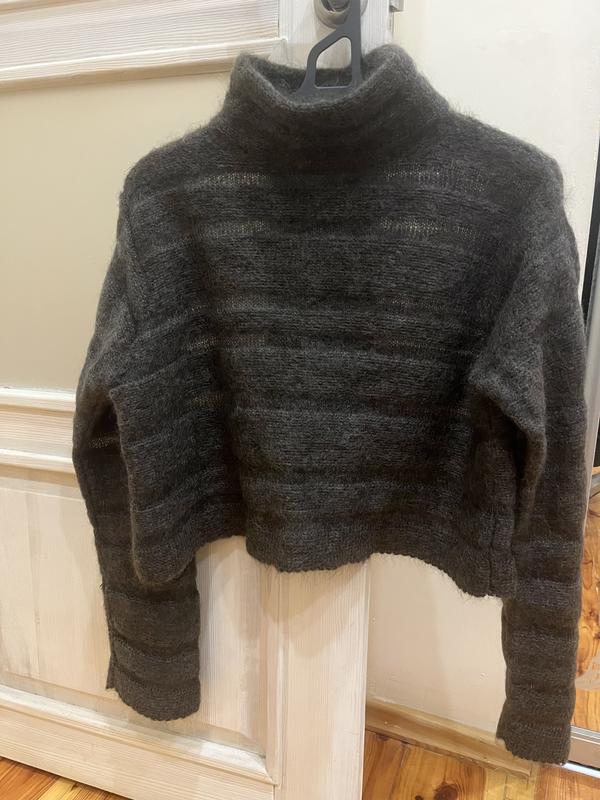 Светр вкорочений від Sarah Pacini з горловиною стійкою Тканина натуральна шерсть Комбінована вʼязка в смужку Стильна неповторна річ Колір оливковий/ хакі Довжина з горловиною/без - 50/43см Під пахвами 52 см Рукав 60 Плечі 38 Звертайтесь 🌷