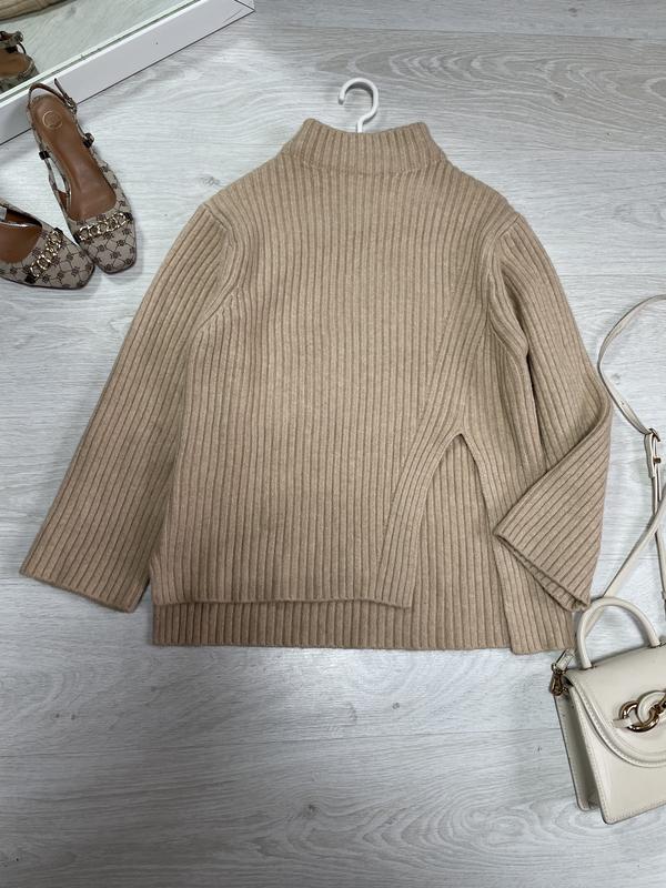 Стильна кофта з розрізом спереду, гарного карамельного кольору. На С теж класно сідає. Довжина 61/66, Пог 51, рукав від горловини (стійки) 64