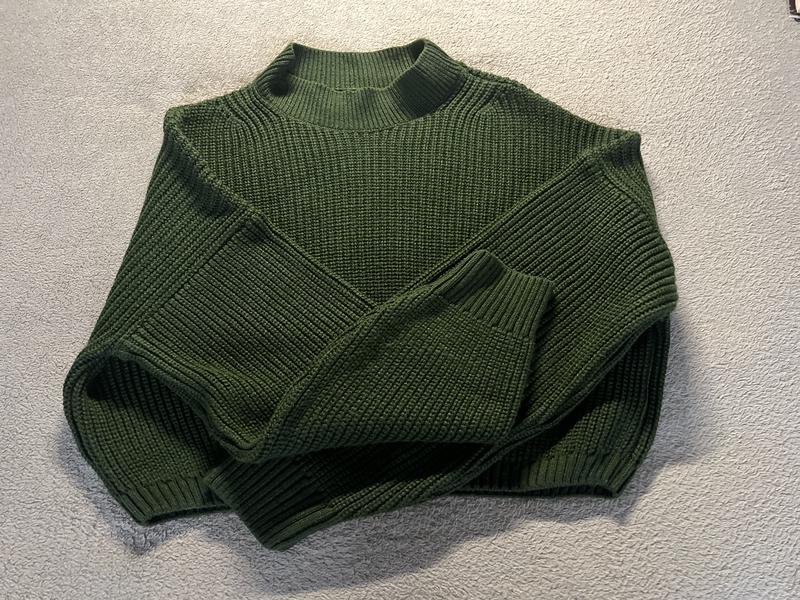 Вкорочений светр зеленого кольору. Занижена лінія плеча. Гарно сідає на xs/s, по барці м. Заміри: Пів обхвату під руками: 53 Довжина 40 Без дефектів