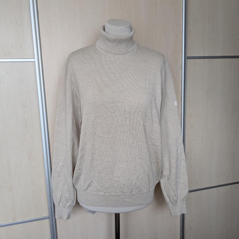 без недостатков цвет: беж состав: 100% мерино шерсть размер: 38, ( однако ориентируйтесь по замерам) замеры: длина: 64 полуобъем груди: 54 ширина плеч: 44 длина рукава: 58, от шеи 72 низ: 37, тянется до 47 высота воротника: 14