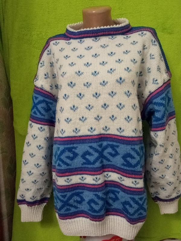 Дуже тепленький світерок. Напівобєм грудей 65 см. Напівобєм талії 63 см. Напівобєм стегон 62см. Знизу резинка. Довжина рукава від шиї 75 см. Сезон демісезон. Розмір 54-56.