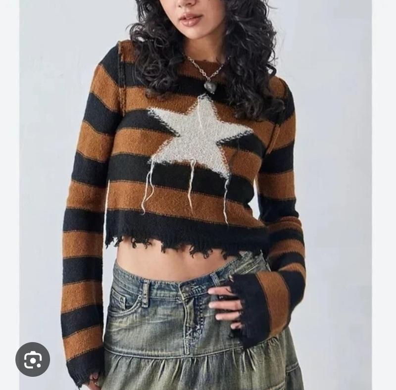 Це коричнево-чорний смугастий светр із білою зіркою.Він має рваний або навмисно зістарений вигляд по нижньому кро..Комір-човник.Довжина 40см.Рукав 60см.Пог 39см