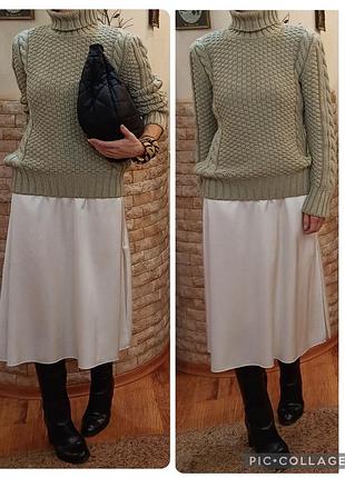 Светр від італійського модного будинку Dolce & Gabbana, який випускає колекції одягу люксового класу. Модель у стилі "тиха розкіш". Прямий сілует, низ із заокругленним краєм "напівмісяць", по спинці довша довжина, високий комір, об'ємне фактурне плетіння, декор плетінням "косами", позаду шкіряний патч з металевим логотипом Dolce & Gabbana. Колір - пильний оливковий. Розмір - L. Завдяки особливостям фасону відмінно сідає і на M. Довжина по спинці - 68 см. Довжина спереду - 63 см. Ширина плечей - 43 см. Довжина рукава - 63 см. Об'єм по низу - 92 см. Об'єм грудей (в стягнутому стані) - 98 см. Об'єм талії (в стягнутому стані) - 93 см. Країна виробництва - Італія. Етикетка зі складом зрізана, на дотик - сумішева вовна з додаванням бавовни.