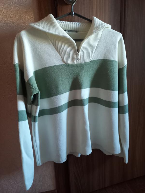 Свитер из легкого гладкого трикотажа, имеет молнию по горловине, сочетание белого и оливково-зеленого цветов. Плечи 57 см, рукав 50 см, длина 58 см, полуобхват груди 54 см, низ 56 см.