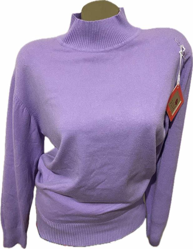 Цей светр має лавандовий (блідо-фіолетовий) колір і високий комір-стійку (гольф). Манжети та низ виробу мають рубчасту в'язку. Склад тканини: * Бавовна (Cotton): 51% * Віскоза (Rayon): 25% * Кашемір (Cashmere): 24% Заміри ПОГ- 52 см Довжина виробу- 65 см Довжина рукава від горловини- 73 см Заміри на пудровий колір( фото4) ПОГ- 53 см Довжина виробу- 68 см Довжина рукава від плеча- 73 см Заміри на сірий колір ПОГ- 53 см Довжина виробу- 65 см Довжина рукава від горловини- 75 см
