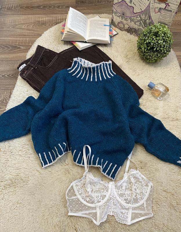 ❗️Кожна третя (найдешевша) річ у подарунок (1+1=3), за умов «оплати на картку»❗️Всі деталі в профілі «про мене»❗️ Вʼязаний светр бірюзового кольору з контрастною білою обробкою розмір універсальний найкраще підійде S, має комір-стійку та спущені рукави-реглан. Цей светр крупної вʼязки з додаванням вовни має текстурований вигляд та декорований контрастною білою окантовкою вздовж коміра, манжетів та подолу. Довжина 52см., півобхват грудей 58см., низ 54см., довжина рукава від горловини 64см., висота горловини 9см. В відмінному стані без дефектів.