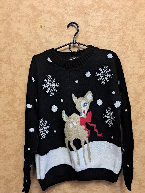 Новогодний свитер с олененком в хорошем состоянии без дефектов 44-46. Длина 62 ПОГ 54-55 Рукав от плеча 58