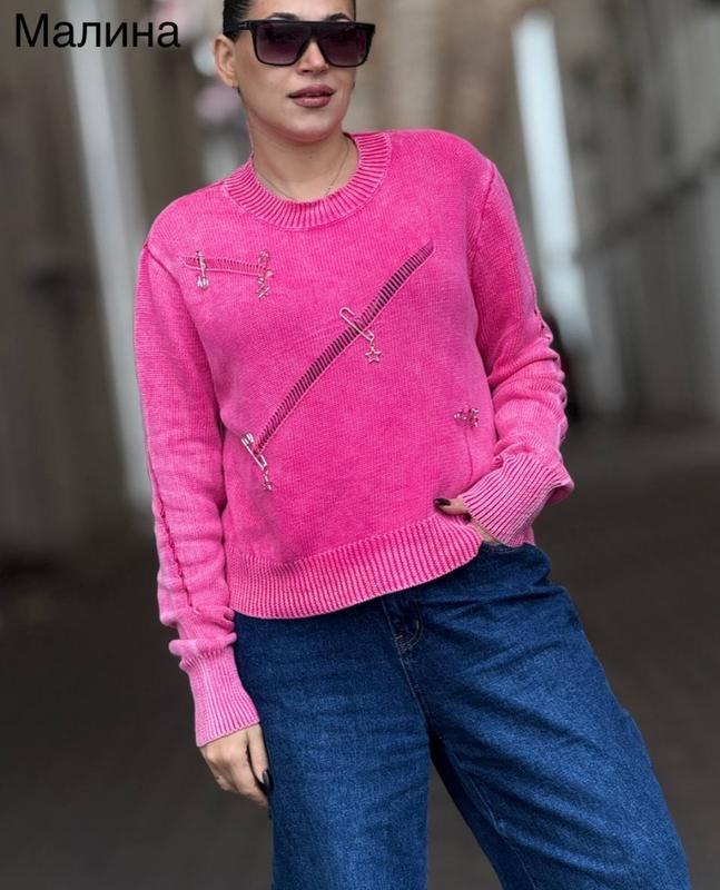 💙💛СВЕТР ЖІНОЧИЙ💛💙 😍Cвирик в самых любимых цветах, что обеспечит комфорт и стиль - одновременно. Моделька с элементами рванки и дополнена булавками. Ткань приятная к телу. Красиво тянется. Страна производитель: Китай. ✂️Материал: кашемир/машинная вязка ⭐️Хорошего качества. 🏷 Размеры: универсальный (42-48). 📏📏📏Замеры: Длина изделия - 46 см. Длина рукава - 62 см. Ширина плечей - 48 см. Ног - 58 см. Низ - 50 см. Колборы: малина и коричневый