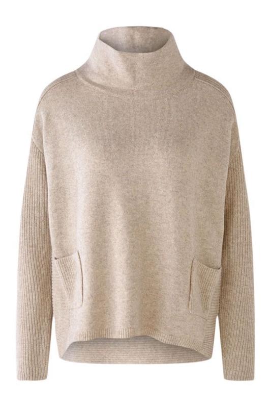 Стильний светр OUI у благородному бежевому відтінку. Лаконічний крій, м’яка висока горловина та акуратні деталі створюють елегантний, дорогий вигляд. Якісний трикотаж із додаванням натуральної шерсті забезпечує комфорт і тепло.